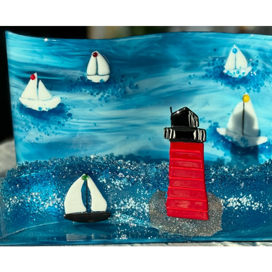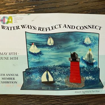The South Haven Center of the Arts in South Haven Michigan, the had a members only exhibition titled "Water Ways: Reflect and Connect." As a member, Terri created this piece just for this show. She did a beautiful 3D piece showcasing South Haven's famous lighthouse Big Red with a stunning creation of Lake Michigan.